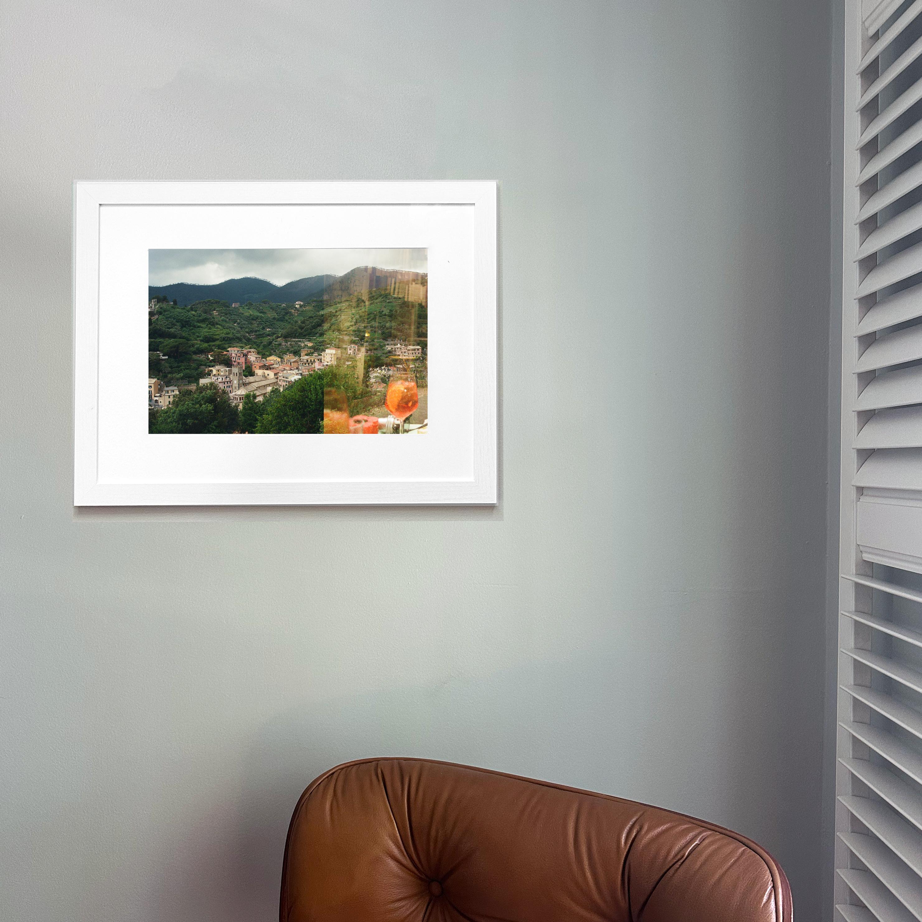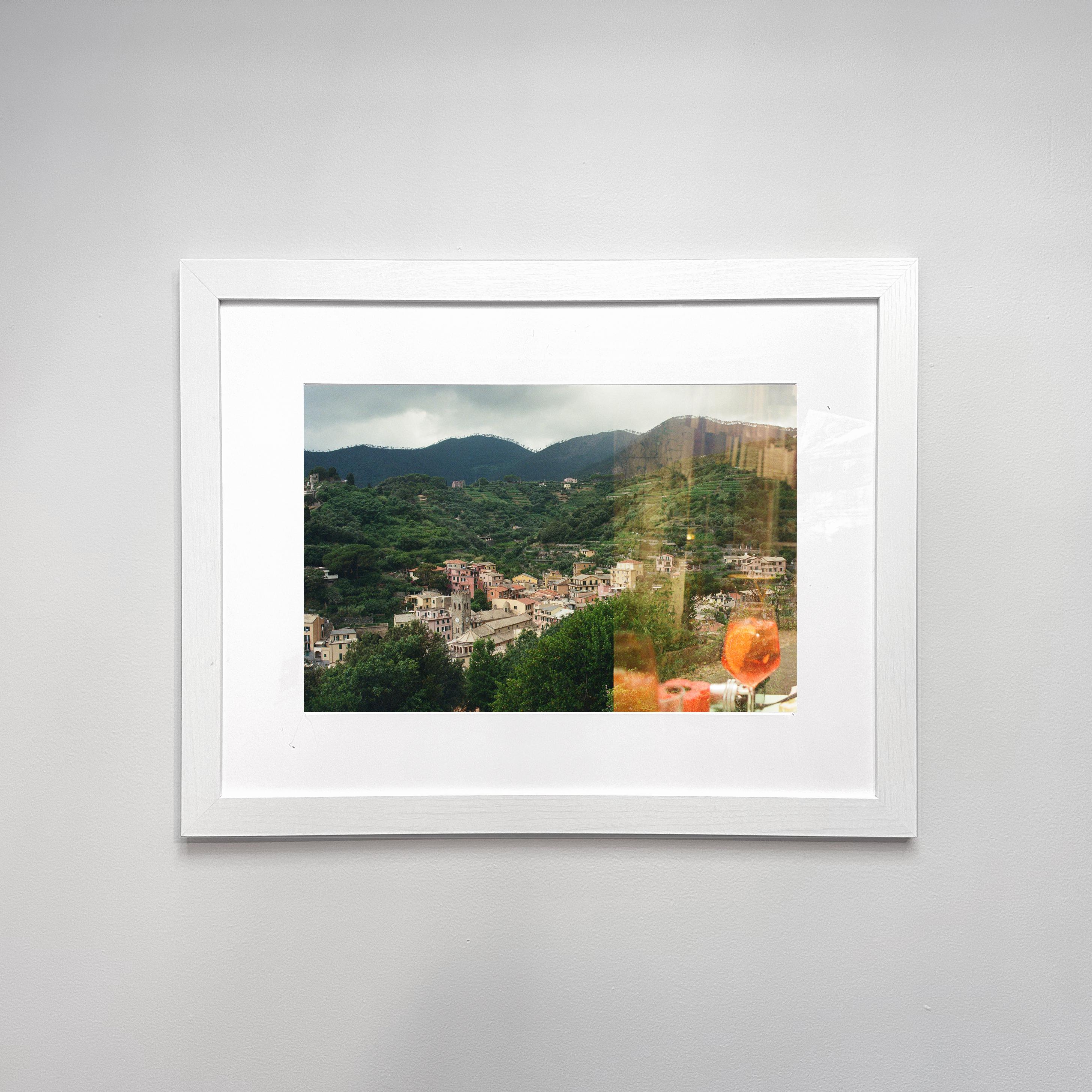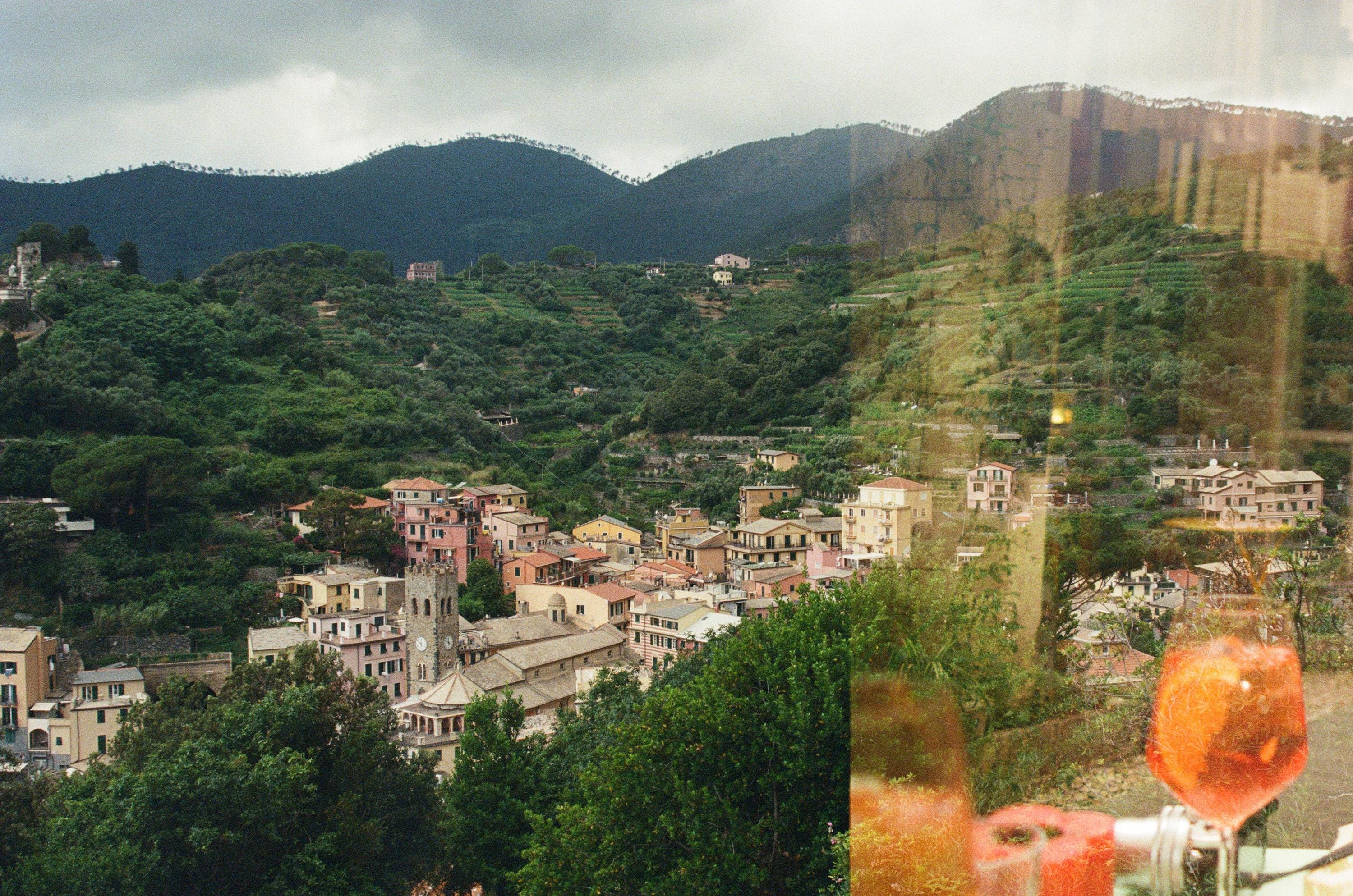 A double exposure film photograph of Italian mountains and a refreshing Aperol spritz.