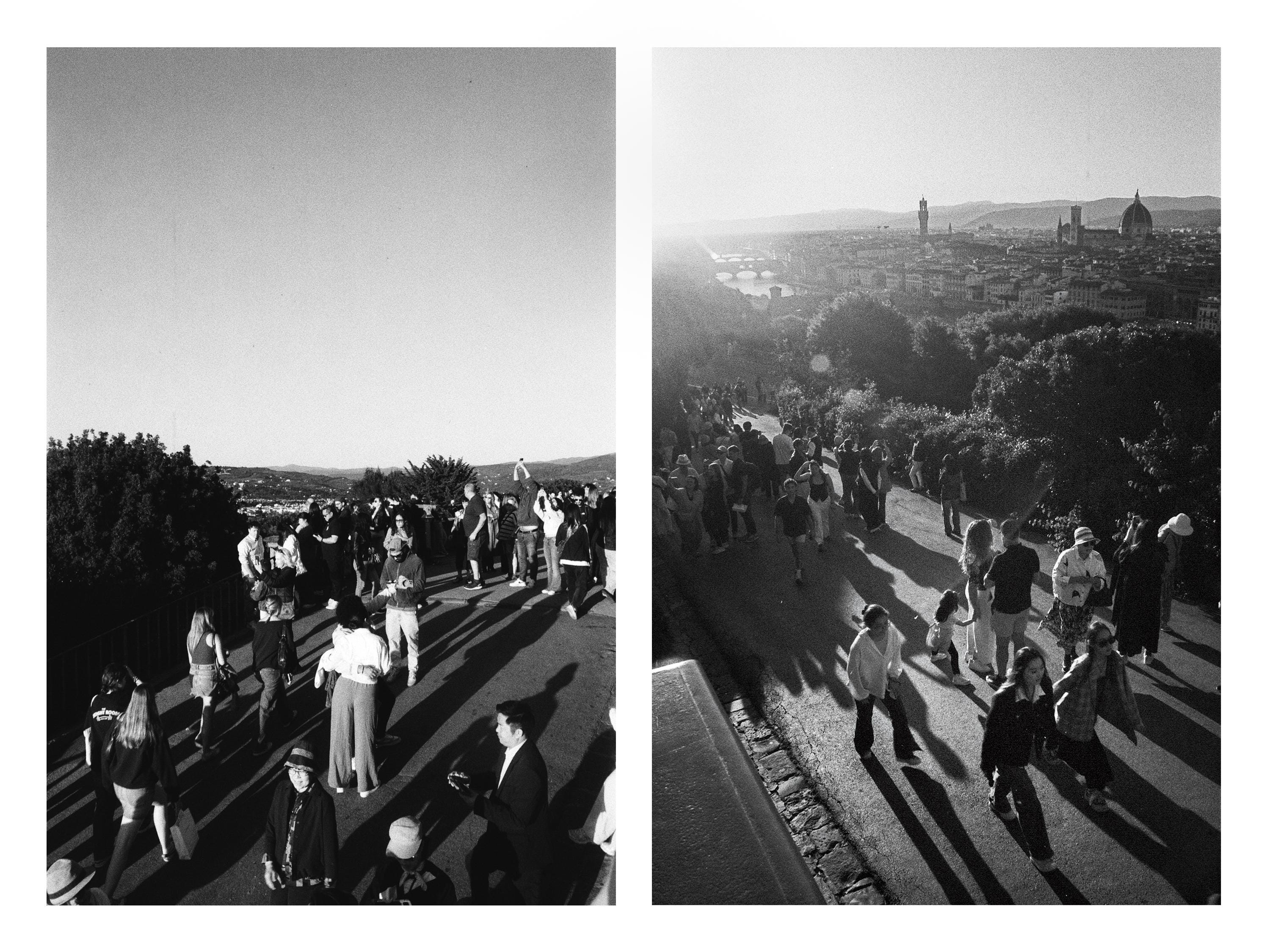 Film photograph collage of a moody sunset in Florence, Italy at the Piazzale Michelangelo.