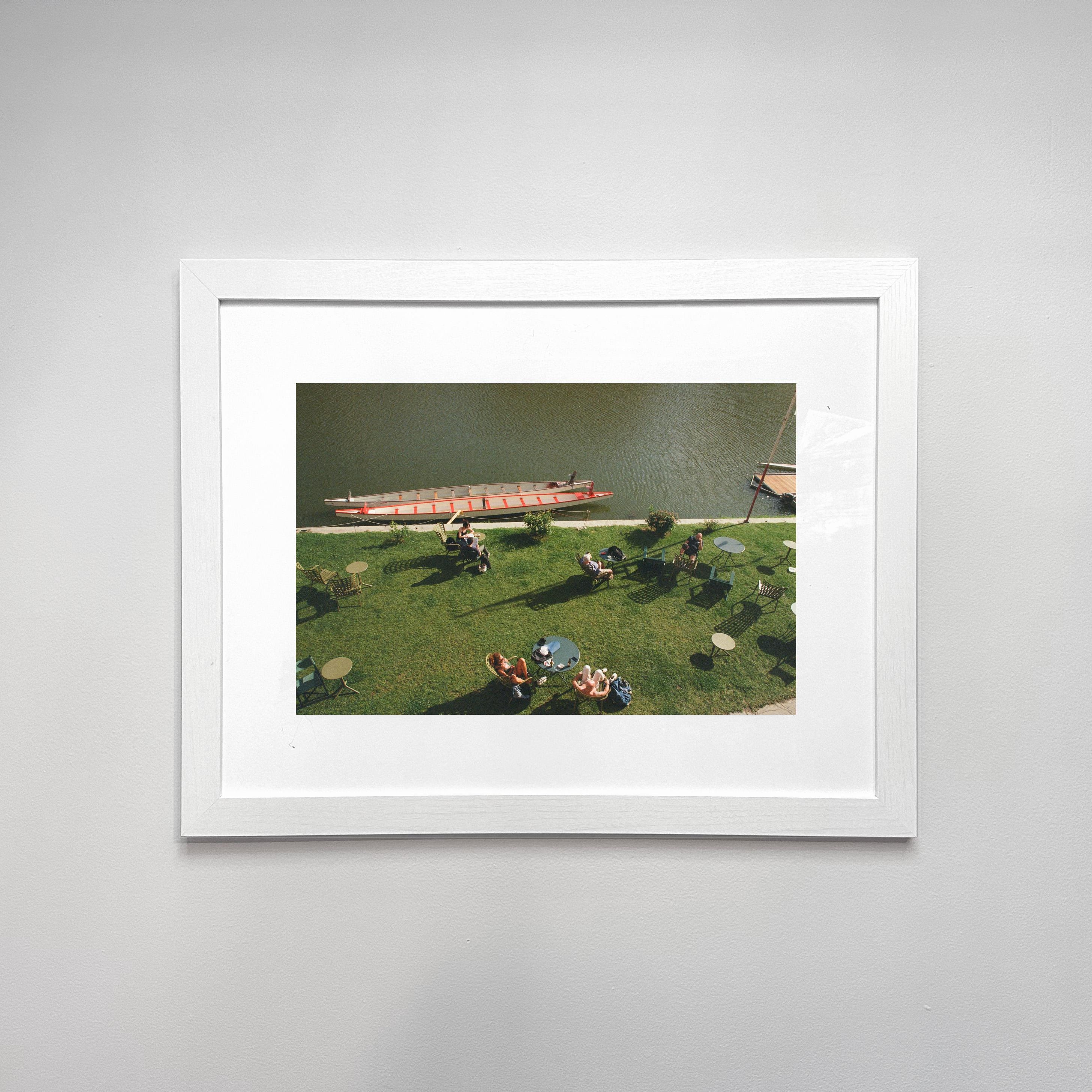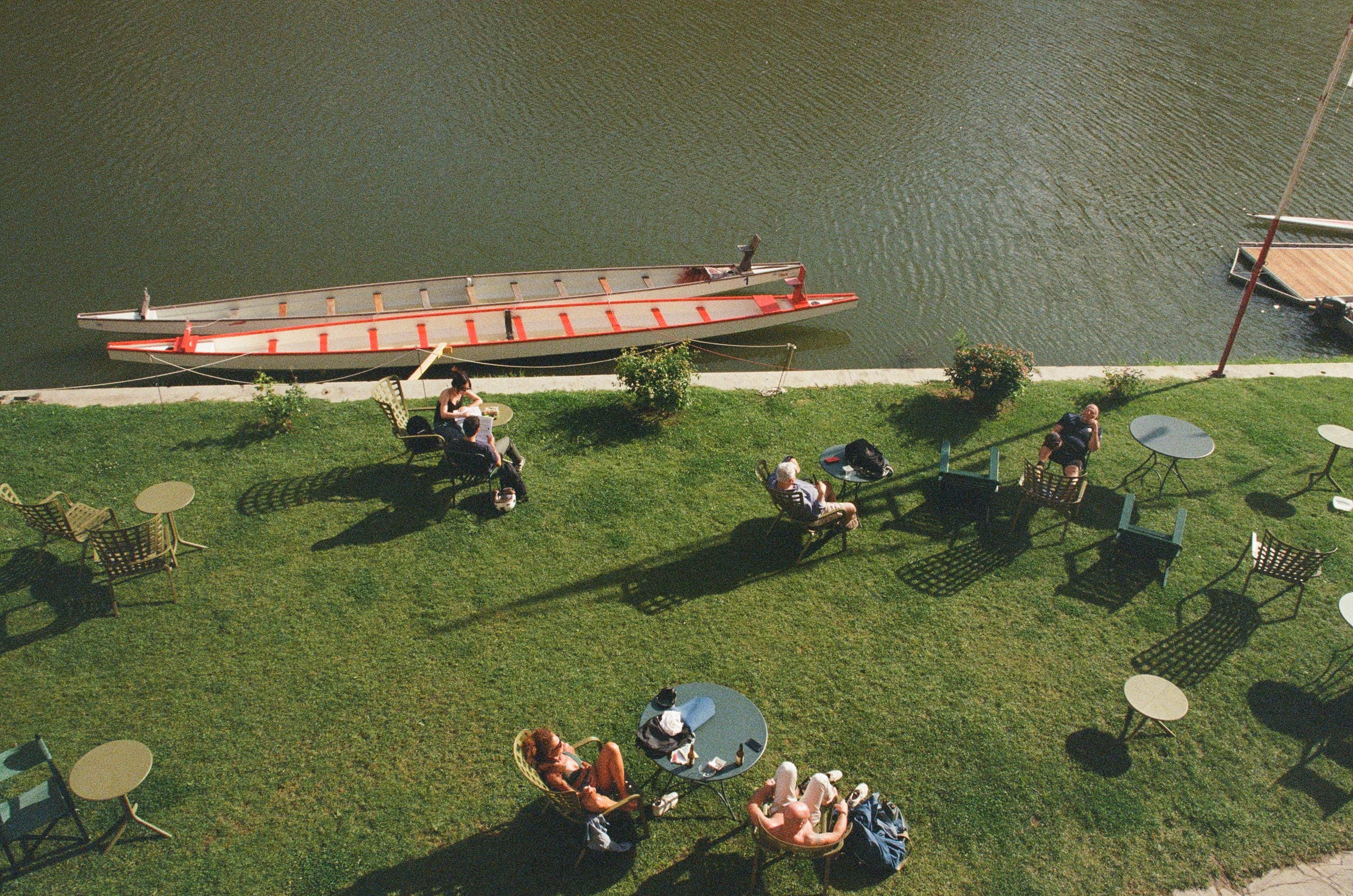 Film photograph of a group of people enjoying the sun while sitting on a bright green lawn on the water in Florence, Italy.