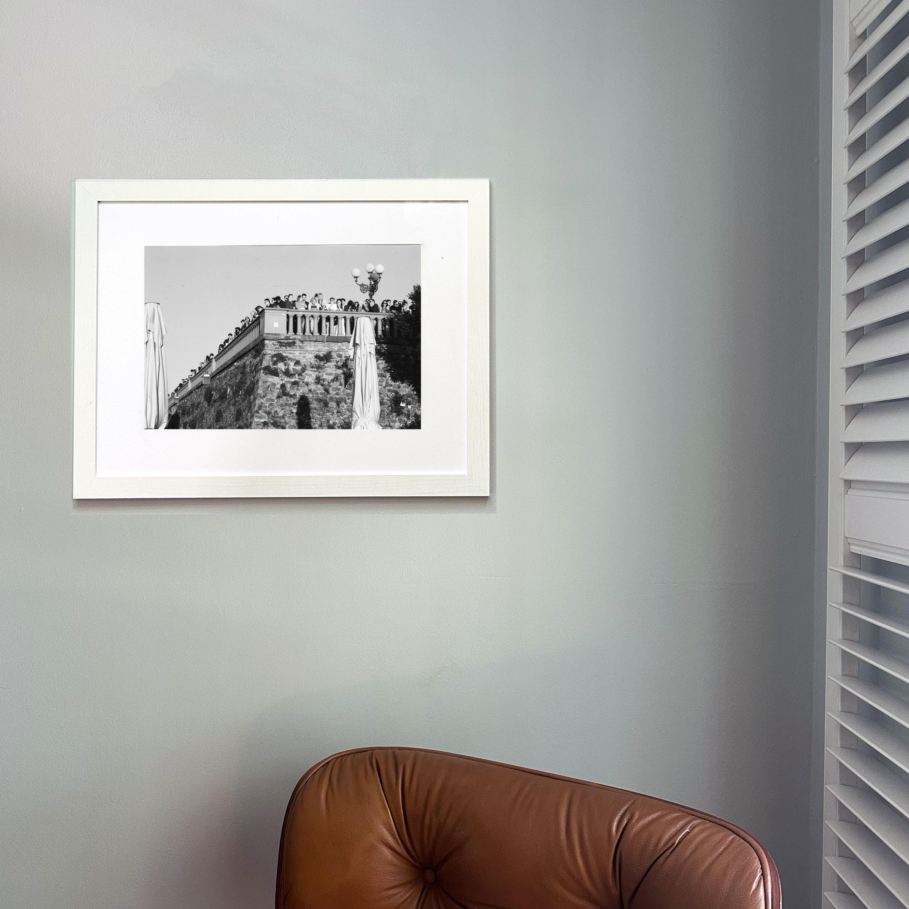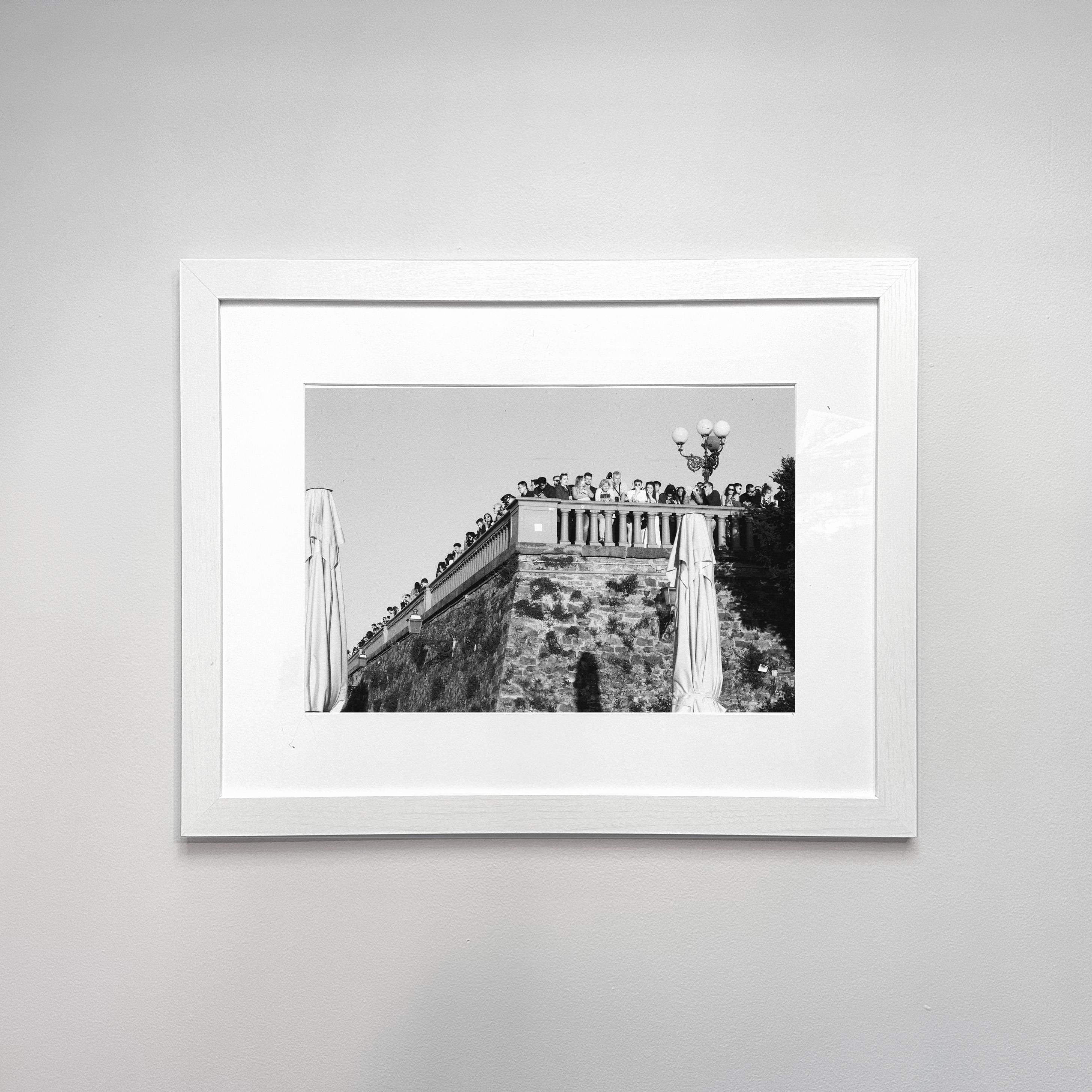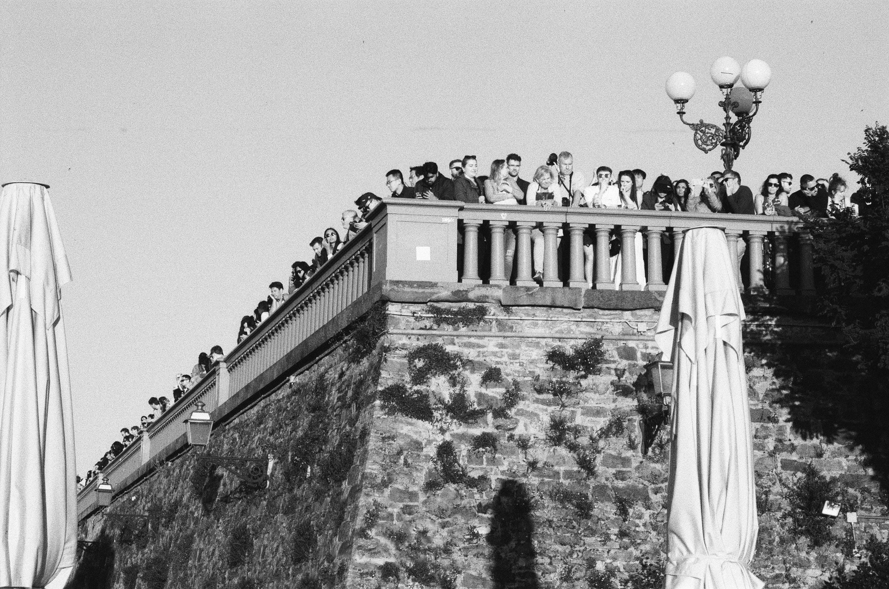 Documentary film photograph of a crowd of people watching the sun set over Florence, Italy at the Piazzale Michelangelo.