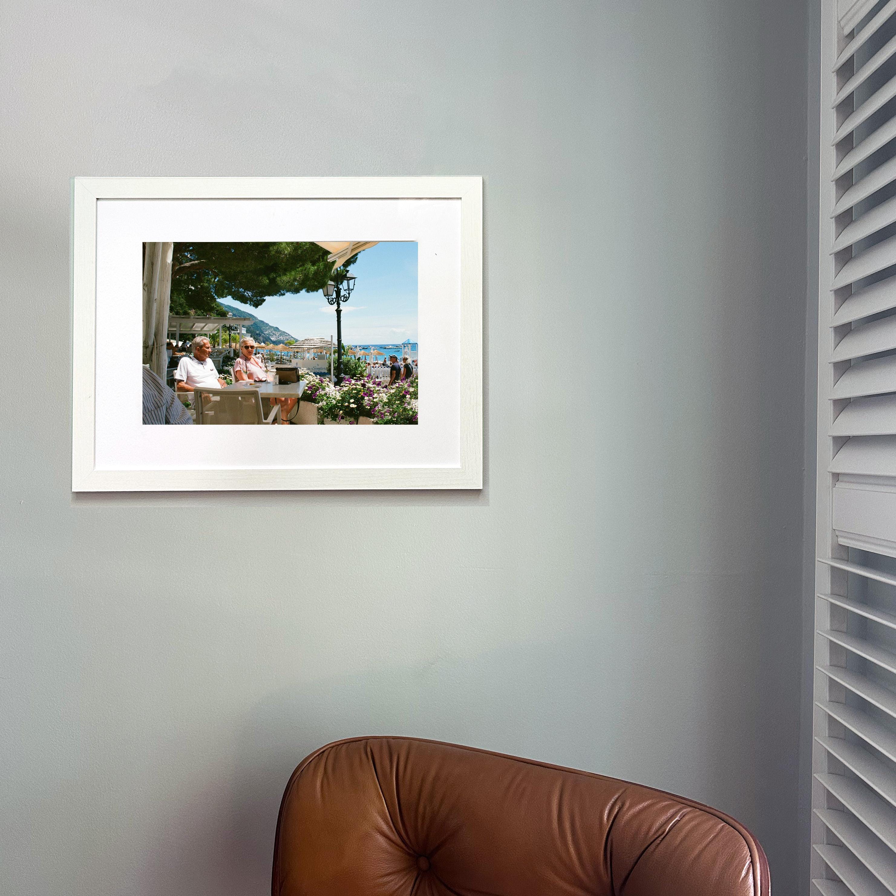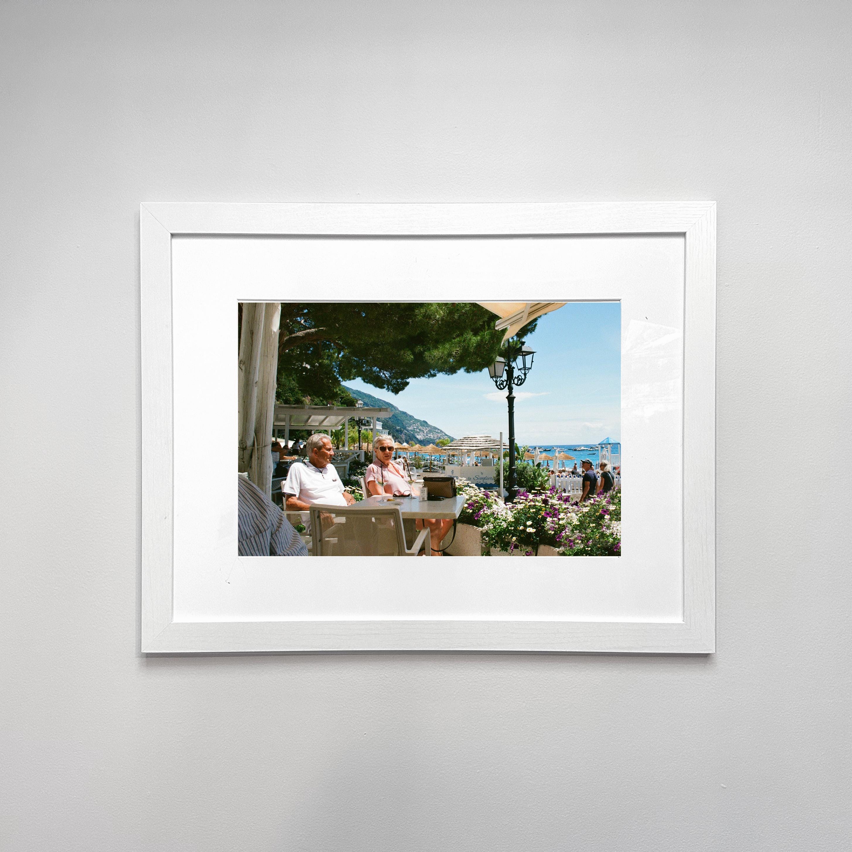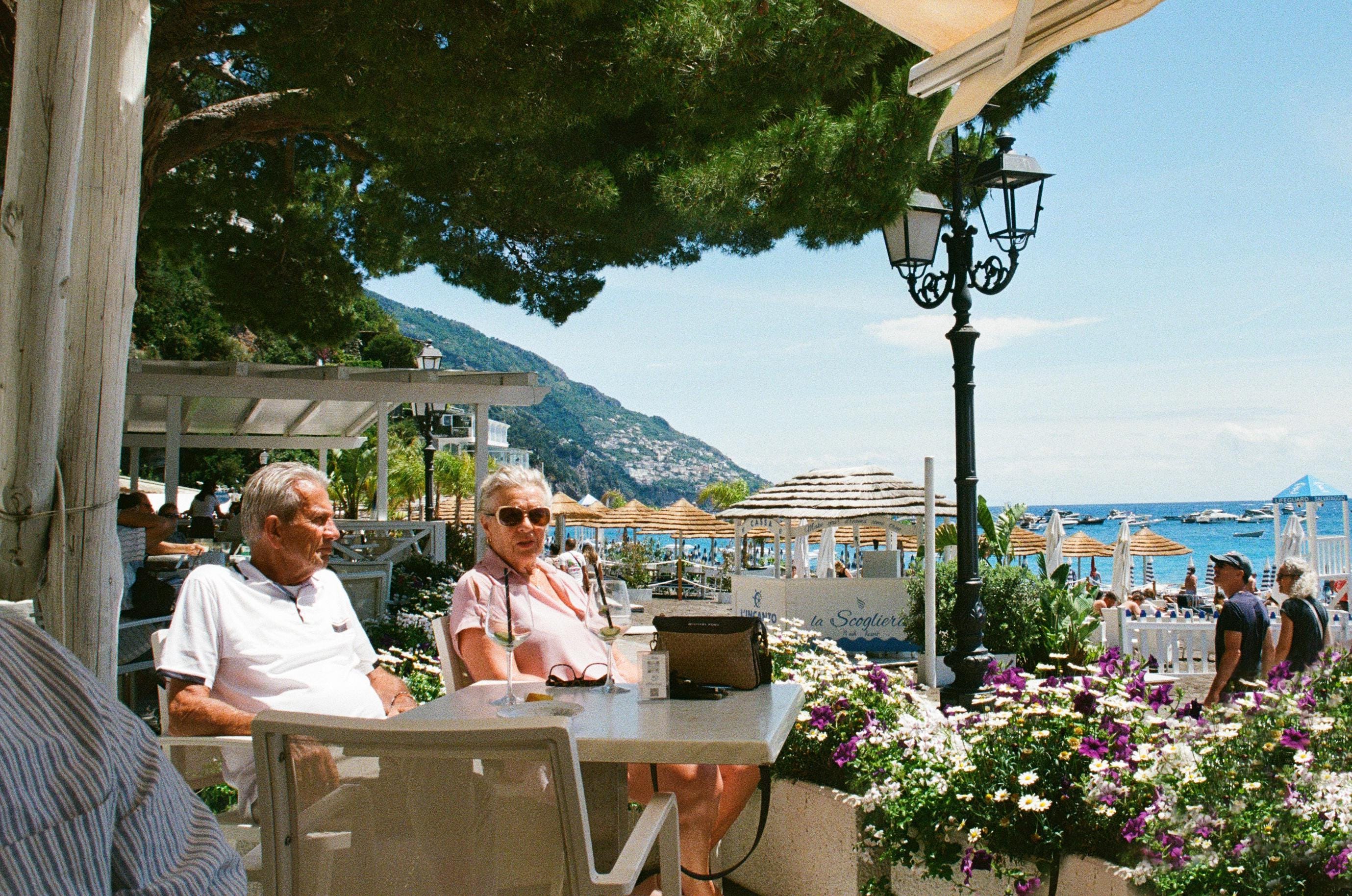 Film photograph of an elderly couple enjoying a vacation together on the Amalfi Coast.