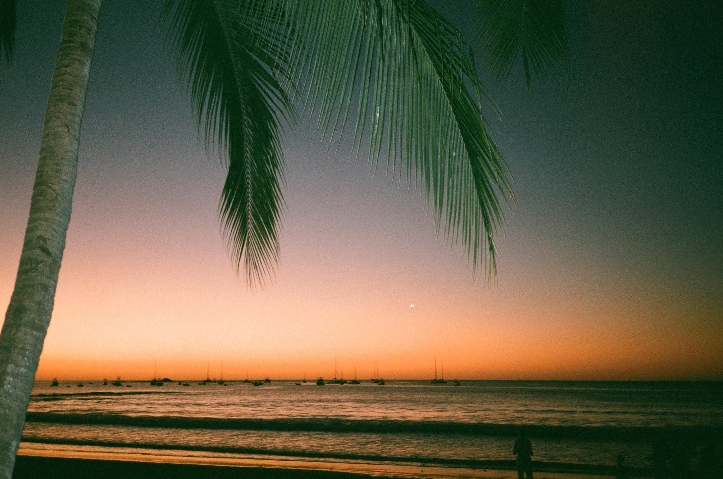 Film photograph of a striking sunset on a beach in Costa Rica, taken with flash which reflects a vibrant palm tree.